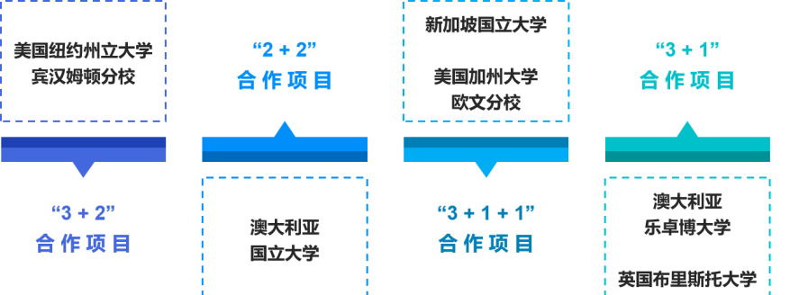 在國(guó)際交流與合作方面,學(xué)生不僅能參加學(xué)校的眾多交流訪(fǎng)學(xué)項(xiàng)目,學(xué)院還與美國(guó)紐約州立大學(xué)賓漢姆頓分校建立了“3+2”合作項(xiàng)目,澳大利亞國(guó)立大學(xué)建立了“2+2”合作項(xiàng)目,新加坡國(guó)立大學(xué)“3+1+1”合作項(xiàng)目,美國(guó)加州大學(xué)歐文分?!?+1+1”合作項(xiàng)目,澳大利亞樂(lè)卓博大學(xué)“3+1”合作項(xiàng)目,英國(guó)布里斯托大學(xué)“3+1”合作項(xiàng)目,為學(xué)生發(fā)展提供了更多的選擇,獲得出國(guó)深造的便捷通道。